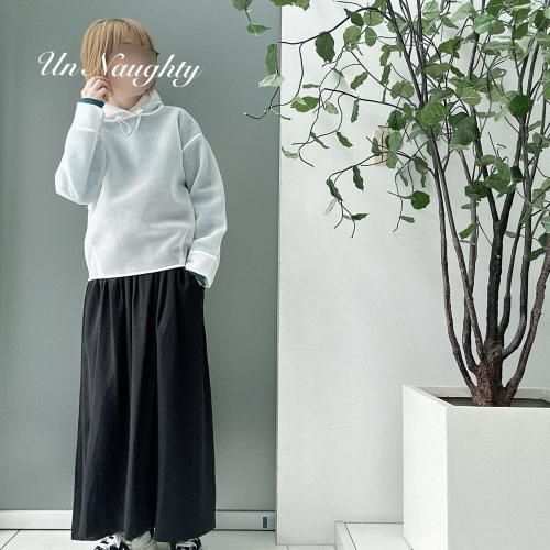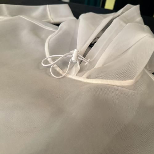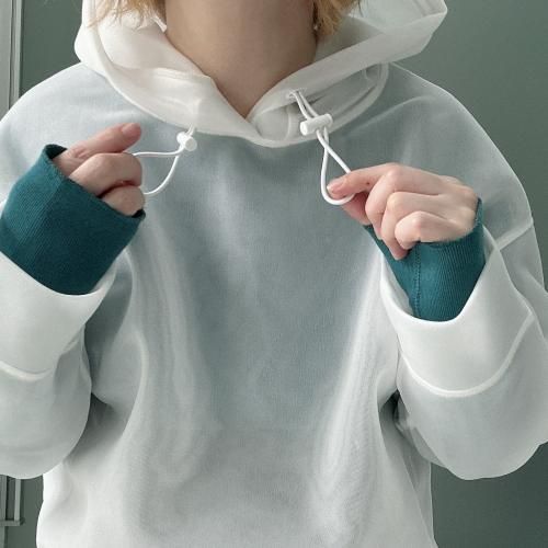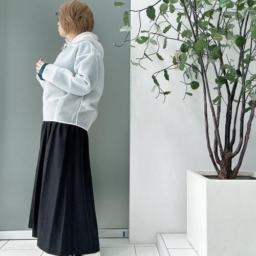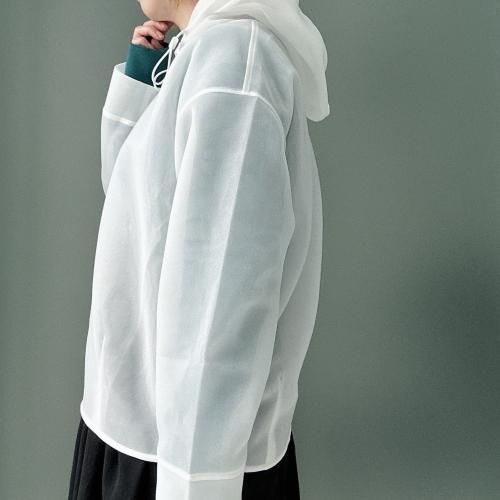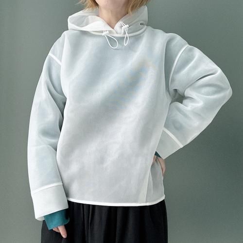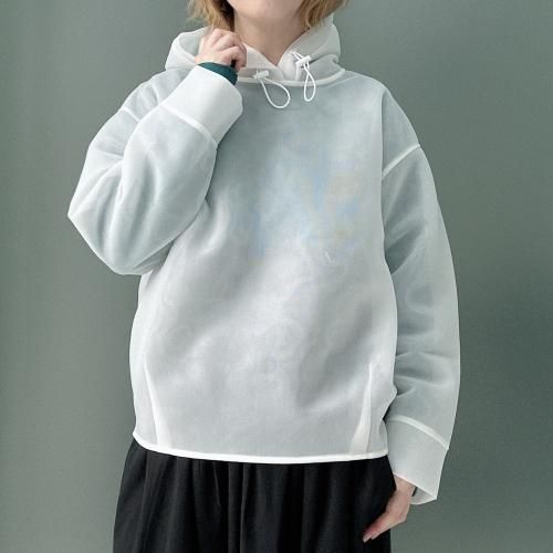 シアーな素材感を活かし、中にカットソーをレイヤードしたりワンピースの上に重ねたりなど、インナーを透けさせることでコーディネートに遊びをもたせられるフーディー。