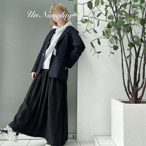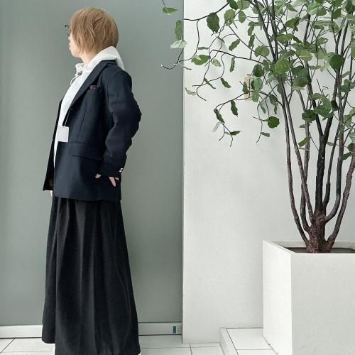 ダンボール特有のしっかりとした厚みとハリ感があるのでシルエットは綺麗に出ますが、見た目以上にさらっとした滑らかな肌触りとシアーで軽やかな素材感なので、重たくなりがちな秋冬シーズンのコーディネートにアクセントを加えられそうです。