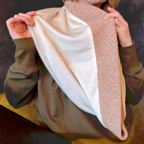 一重で肩にかけショール風にしたり、二重にしてすっぽりかぶり首元を立ち上げたりと色々なアレンジが楽しめます。