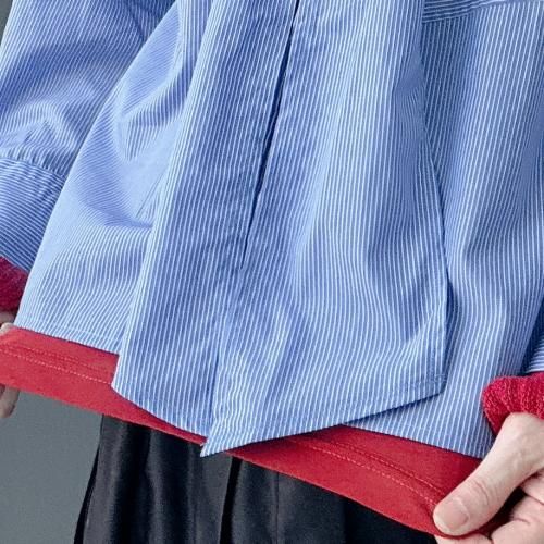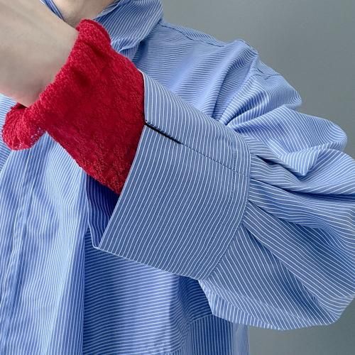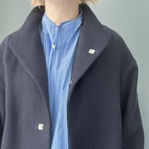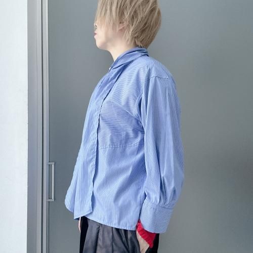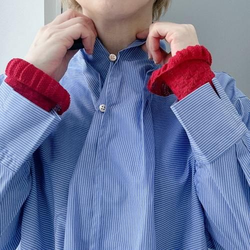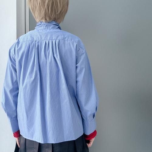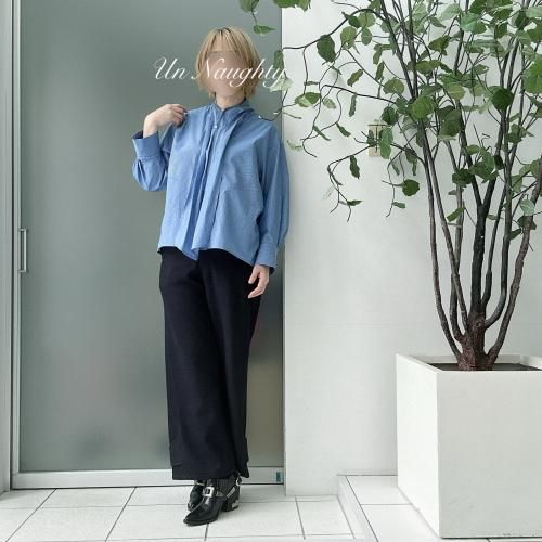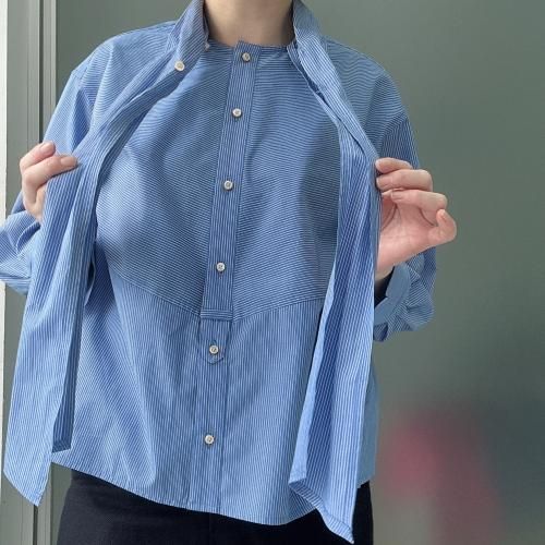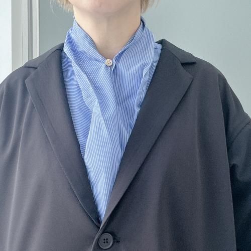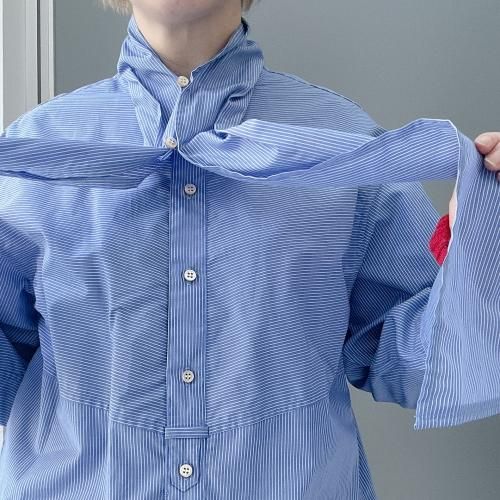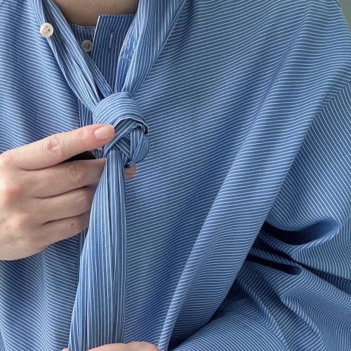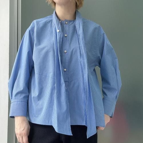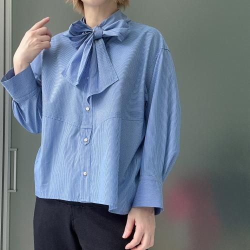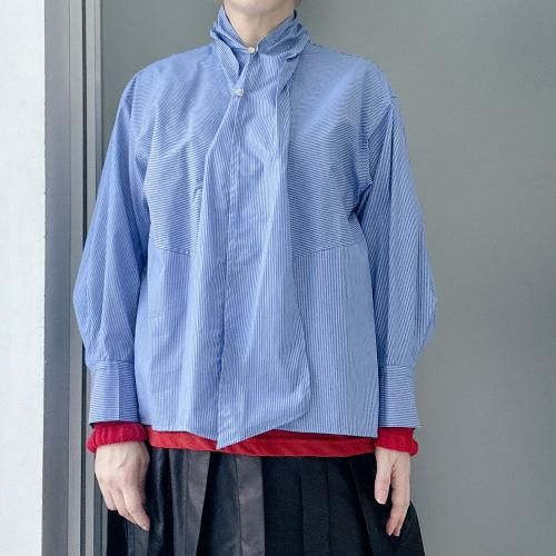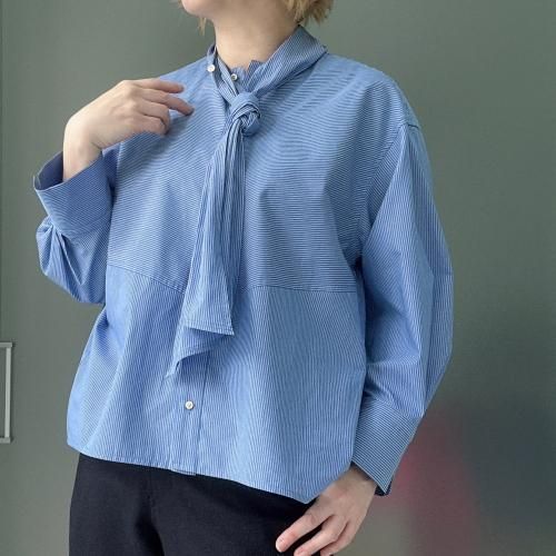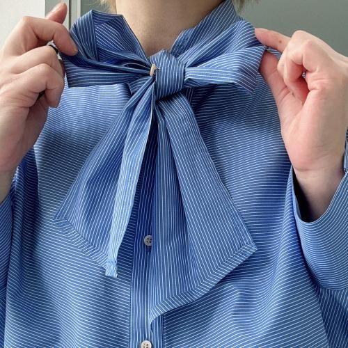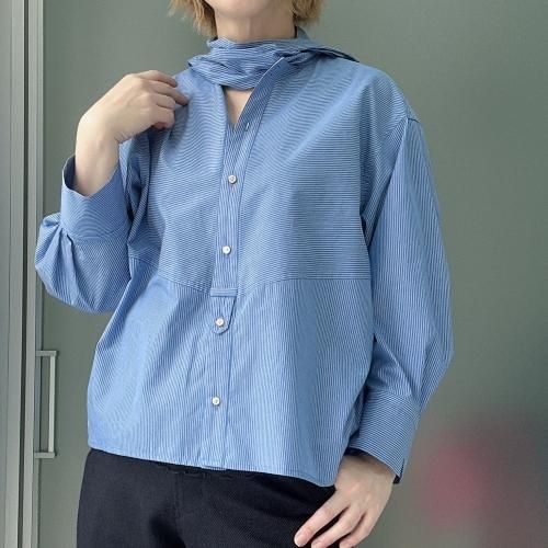 釦を留めてボウタイ風、首に巻いてスカーフ風など、アレンジが楽しめるシャツ。
