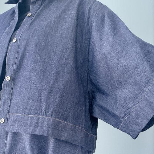 ◆6ozデニム×デニムプリント生地の裾を絞ったり羽織ったりと着こなしのアレンジが楽しめる使い勝手の良いデザインシャツ◆