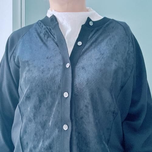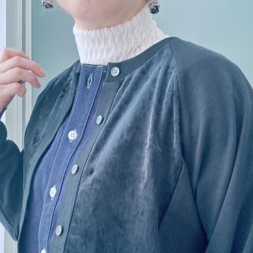 衿・袖口はリブ、前立ては総針の編地を施し、ニット見えする様に仕立てたこだわりのデザイン。