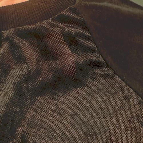 しなやかな落ち感と暖かみのあるニット見えのカットソー素材と、光沢感のあるメッシュベロアふたつのコントラストのある秋冬シーズンらしい素材を組み合わせ、異素材ドッキングデザインがより映えるアイテムとして仕上げたブラウス型トップスです。