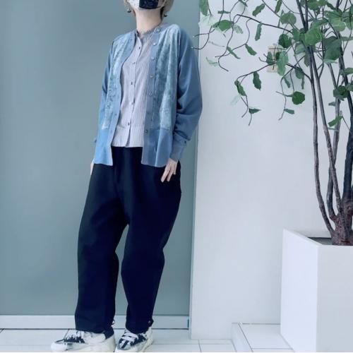 ウールならではのほんのり起毛感があり温かみのある表情ですが、コットンがベースなのでチクチク感もなく着心地の良い素材です。やさしい暖かみがあるので、秋の立ち上がりから長く着用できます。