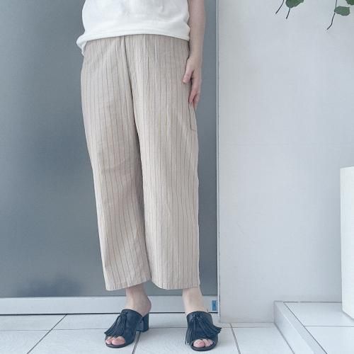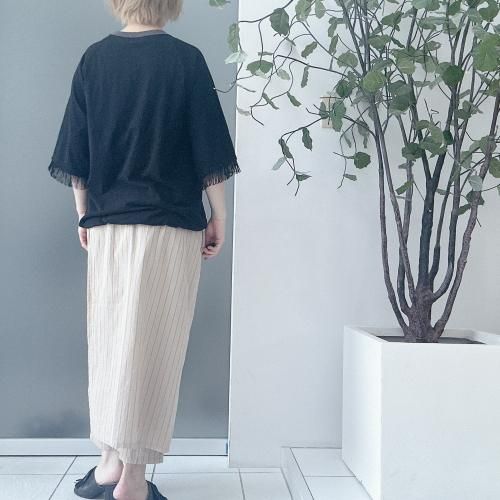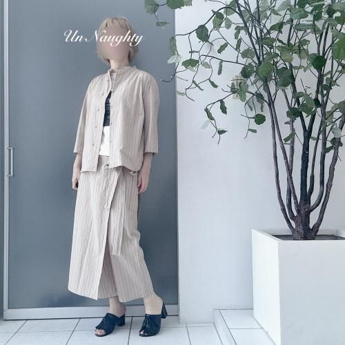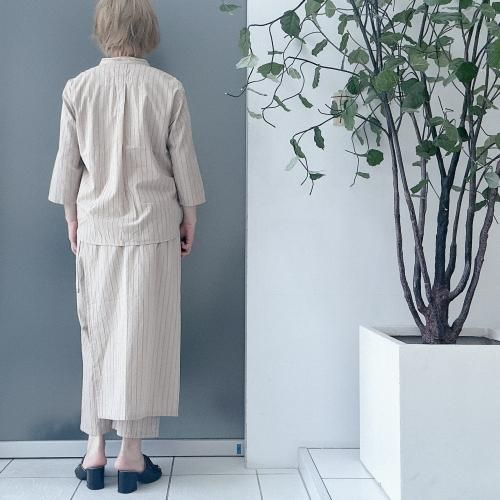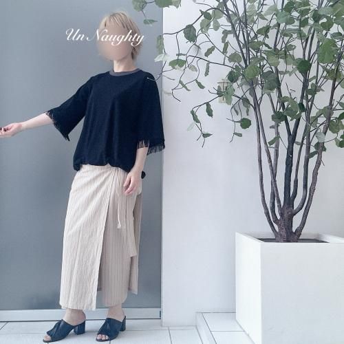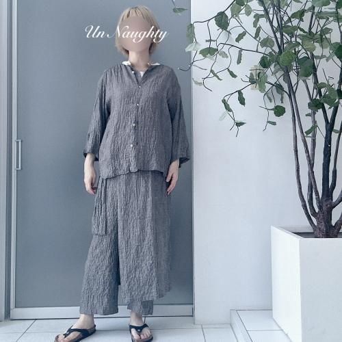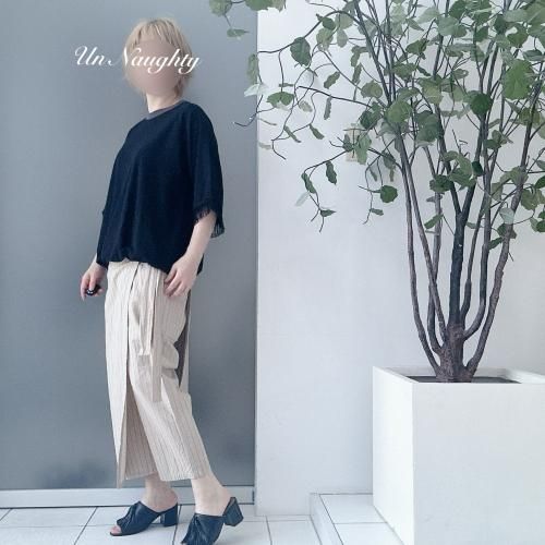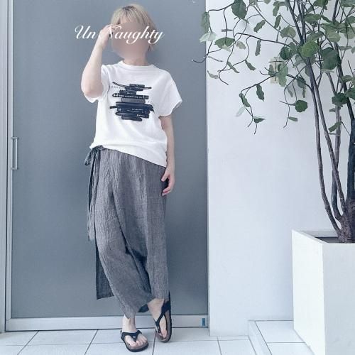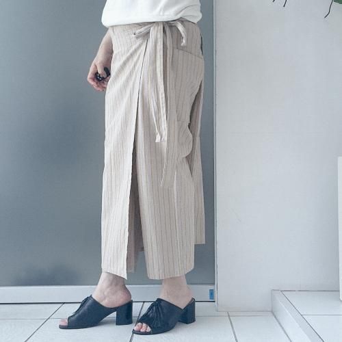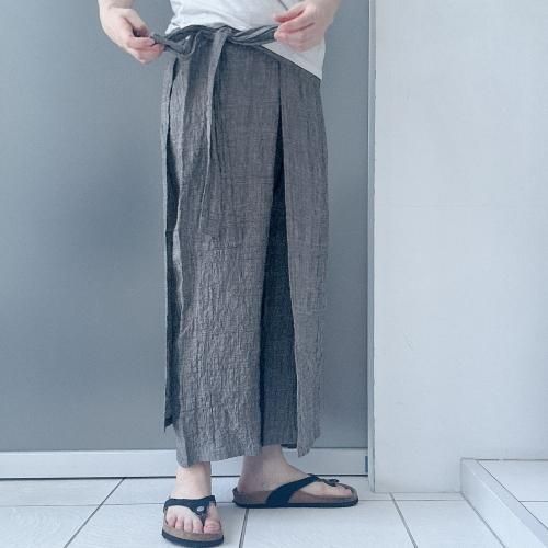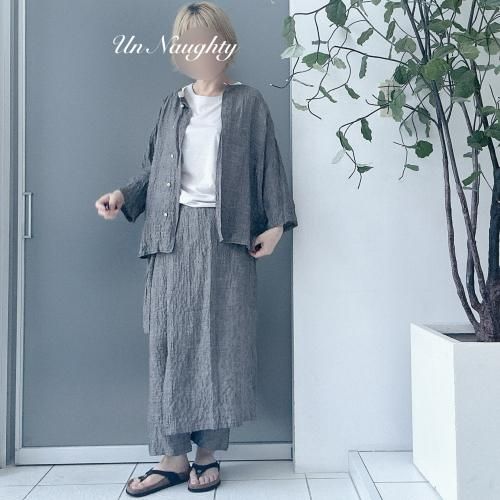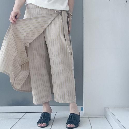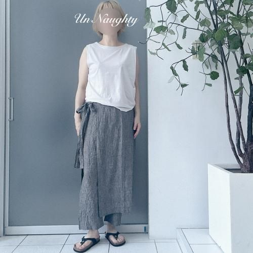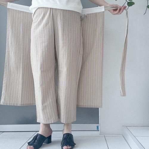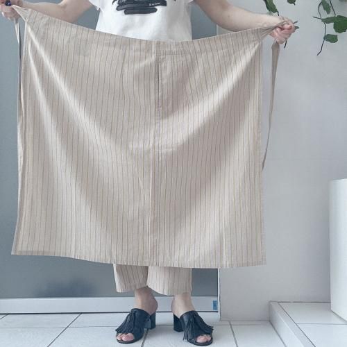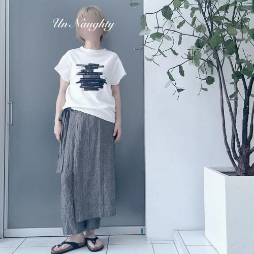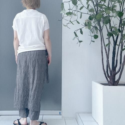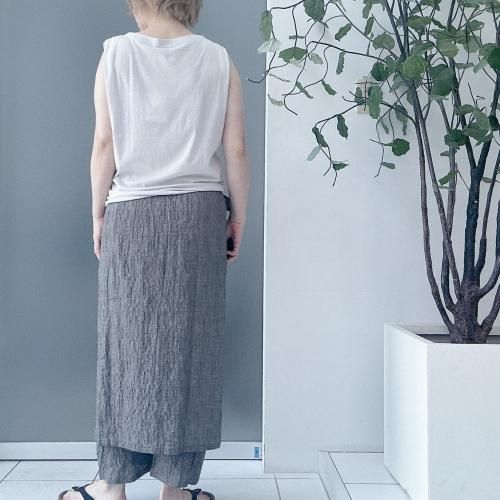 ポケット付きイージーパンツとエプロンスカート、ナチュラルワークなアイテムをセットアップでスタイリングすることで、モダンでクールな印象も楽しめる。