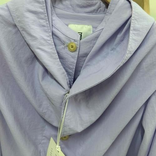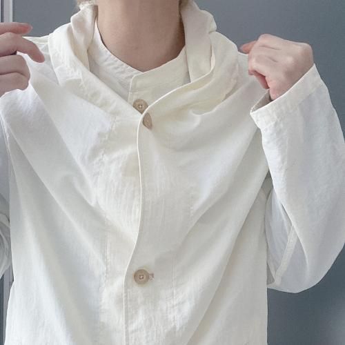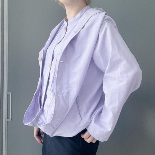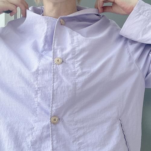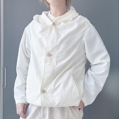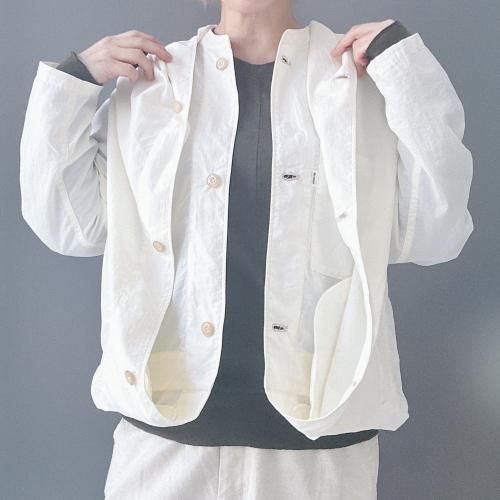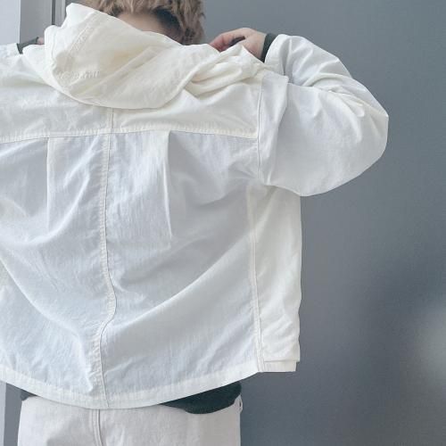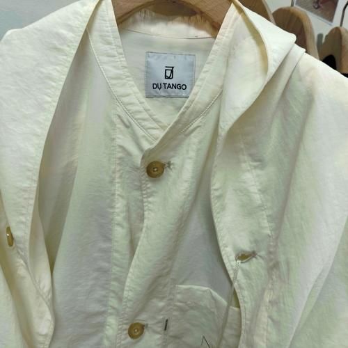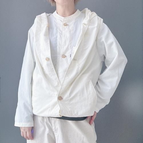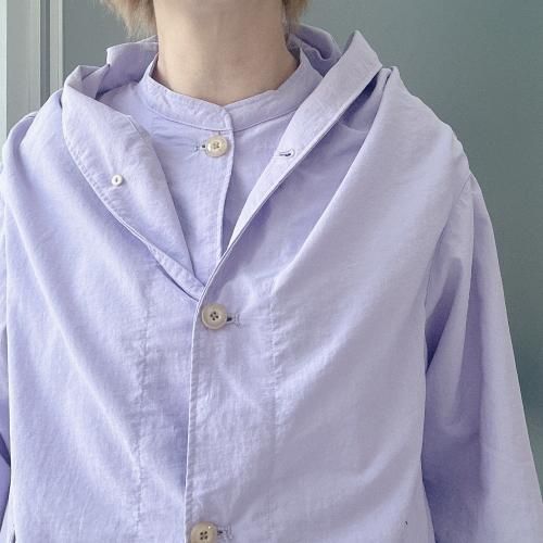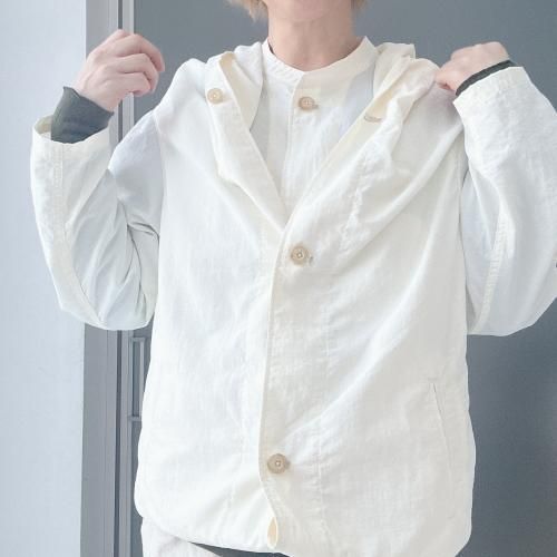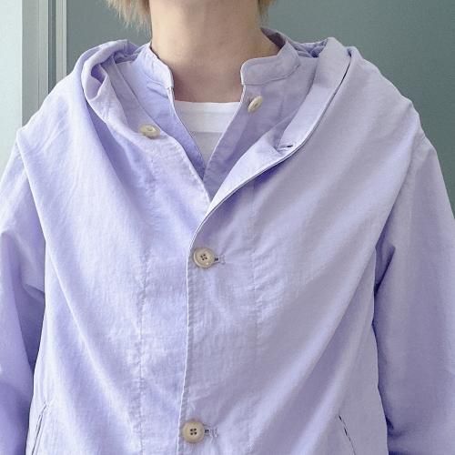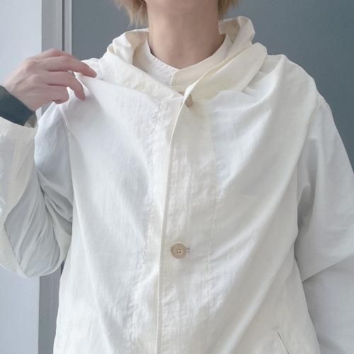 裾で繋げた前身のパーツがそのままフードまで繋がったレイヤードディテールがおもしろい春のアウター。