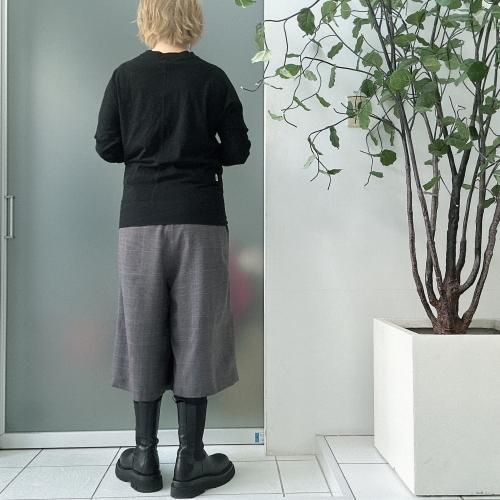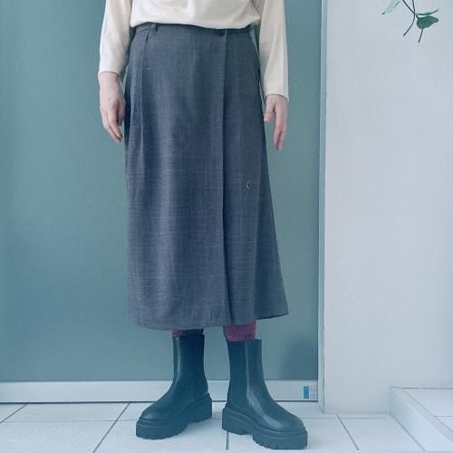 グレンチェック、ピンストライプのマニッシュテイストの梳毛ウールを使用したスカートライクなドレープパンツ。