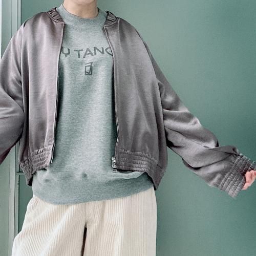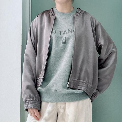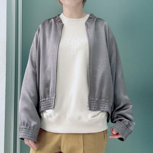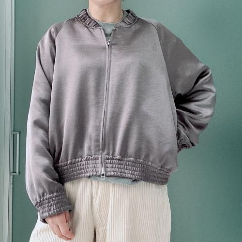 ◆程よい光沢と肉感のサテンで丸みあるシルエットや衿・袖・裾に効かせたギャザーが女性らしさを醸し出したブルゾン◆