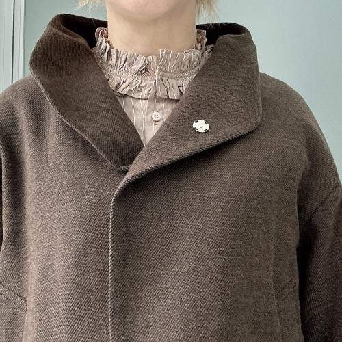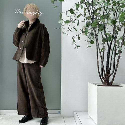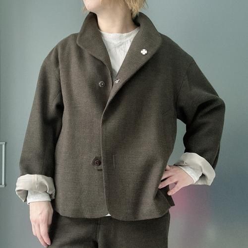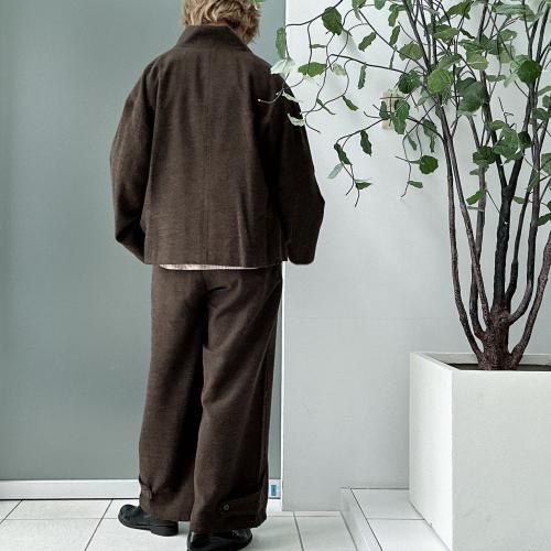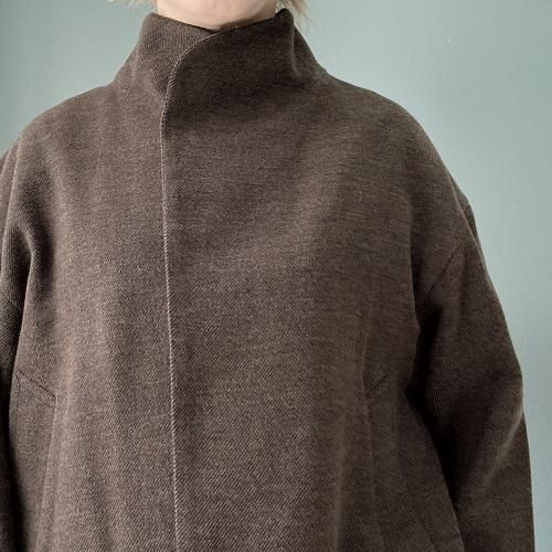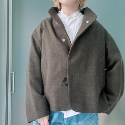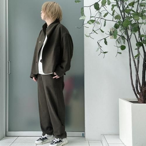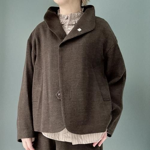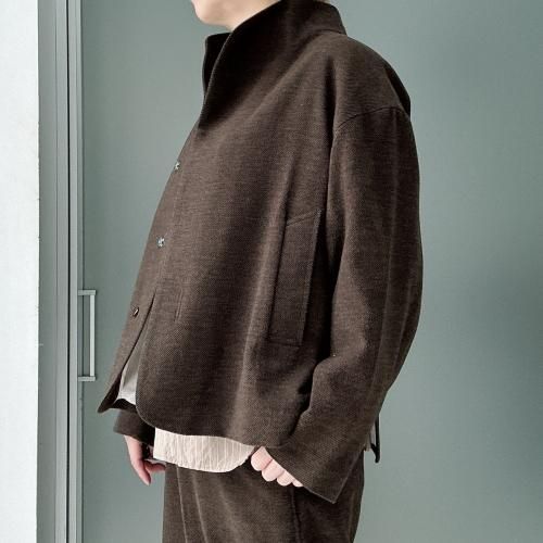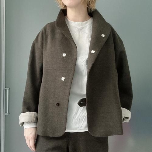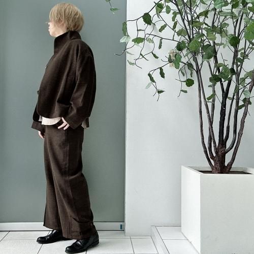 タイニーなボトルネックラインから広がるAラインシルエットがどことなくオールドクラシカルな印象のジャケット。フロントのマグネット釦でミニマムなデザインを保ちつつ、さらりと楽に羽織れます。クレープのような上質感のあるカルゼスウェードはオケージョン対応も可能。DP-0153の2WAYカルゼパンツとセットアップも可能。