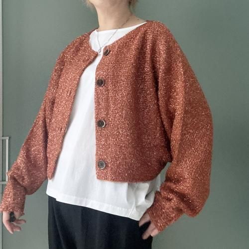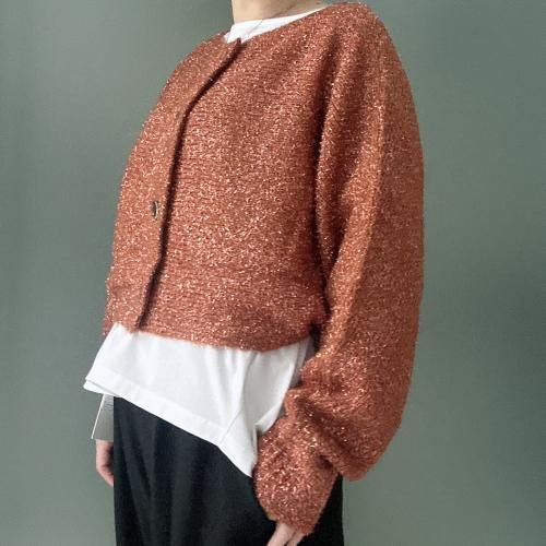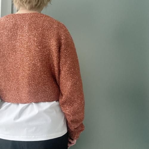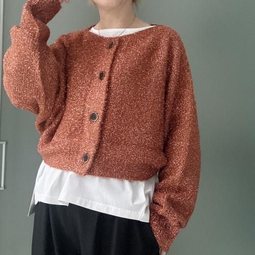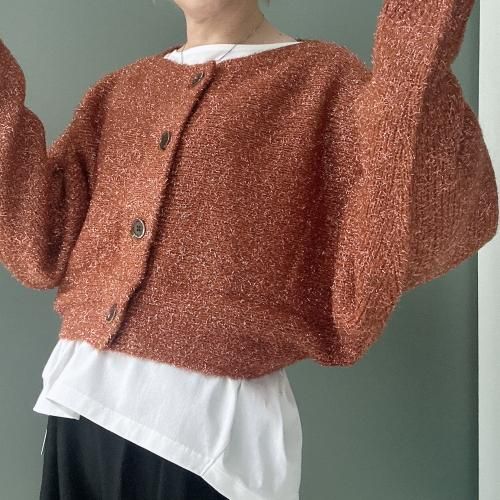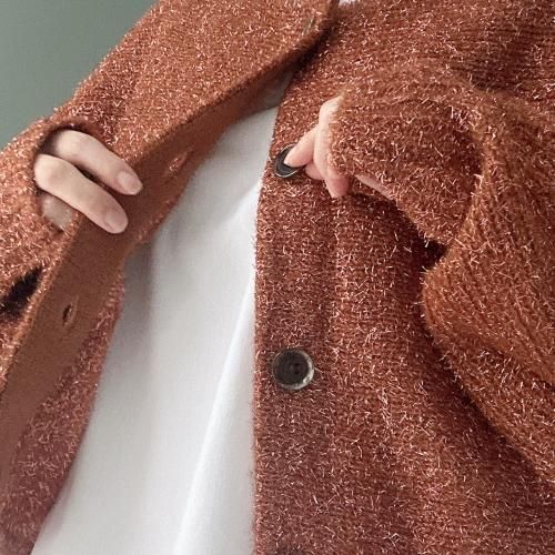 肌触りの良いウールモヘヤ糸と、毛足の長い糸を引き揃えて編み立てた編地は、軽くて着心地よくアイキャッチな存在感漂う一枚。