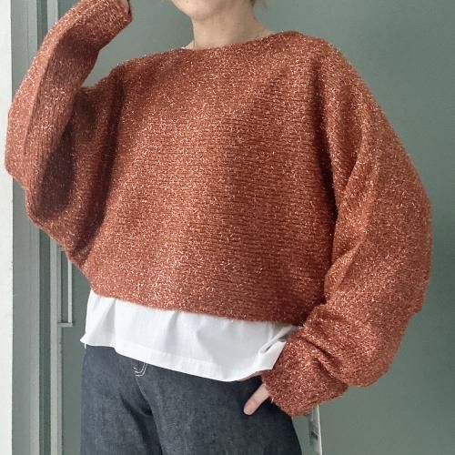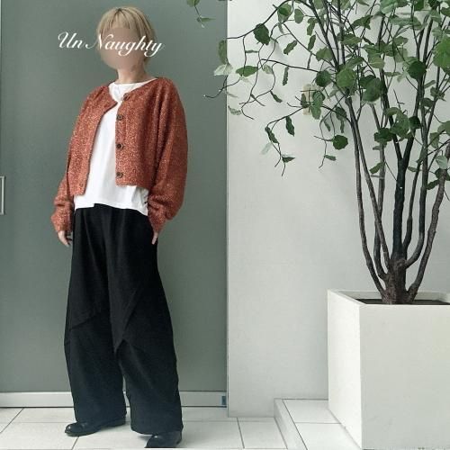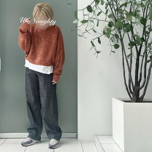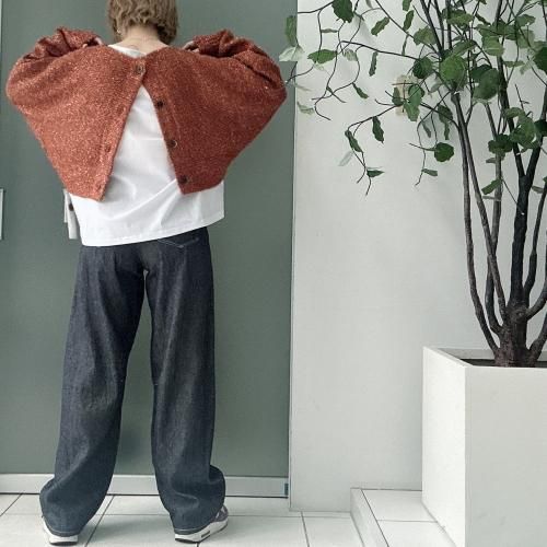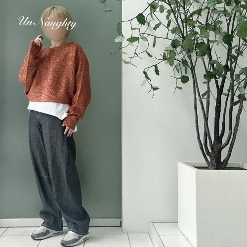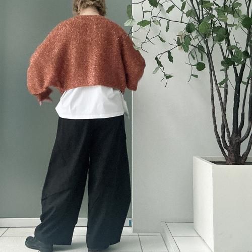 編地にややボリュームがありコンパクトな着丈のため、太めのシルエットのパンツやボリュームのあるボトムスと相性◎