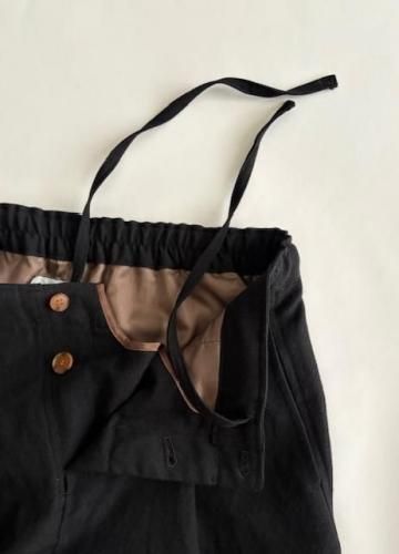 ウエストはゴムと紐、フロントはマチとボタンで開閉します。